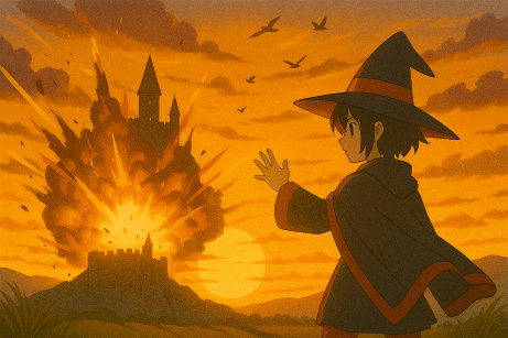 - めぐみんの爆裂魔法発動シーン:毎回全力で放つ一撃は、無駄に壮大で笑える