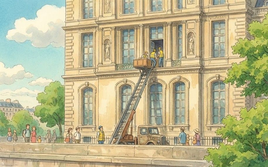 セーヌ川沿いに停まった一台の高所作業車。そこから降りてきたのは、蛍光色の作業服に身を包んだ「どこにでもいる補修業者」たちでした。彼らは堂々と2階の窓から侵入し、わずか4分間でナポレオン時代の至宝を奪い去り、バイクでパリの街へと消えていきました。